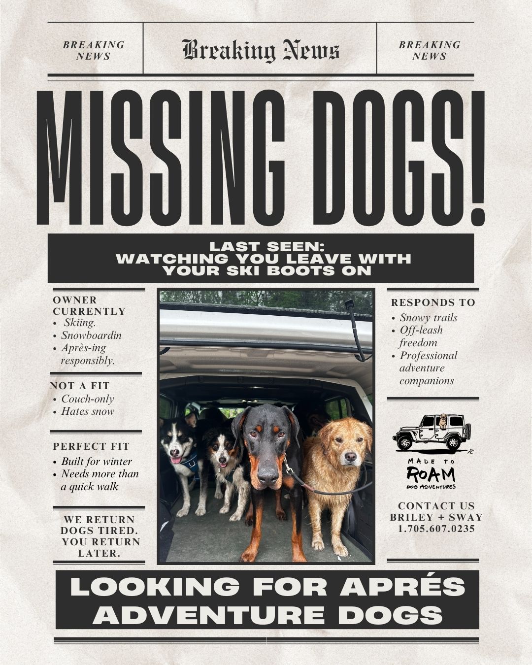 THE WEEKEND APRÈS DOG CLUB IS REAL. While you're sipping your post-ski beverage, your dog could be living their own mountain legend with Made to Roam. What we're serving: ✔️ VIP off-leash mountain adventures ✔️ The kind of tired that sleeps through Sunday brunch ✔️ Pack runs that make regular walks look amateur ✔️ Actual adventure stories (they can't tell you, but they'll show you) NOW RECRUITING WEEKEND WARRIORS 📅 Saturday & Sunday spots available 🏔️ Collingwood's best-kept secret trails 🚙 Door-to-door adventure service Your dog gets the après life. You get your weekend back. 📲 Join the club: madetoroam.carrd.co Warning: May cause extreme happiness, muddy paws, and dogs who judge your Netflix plans Date Posted: 30-Jan-2026 -